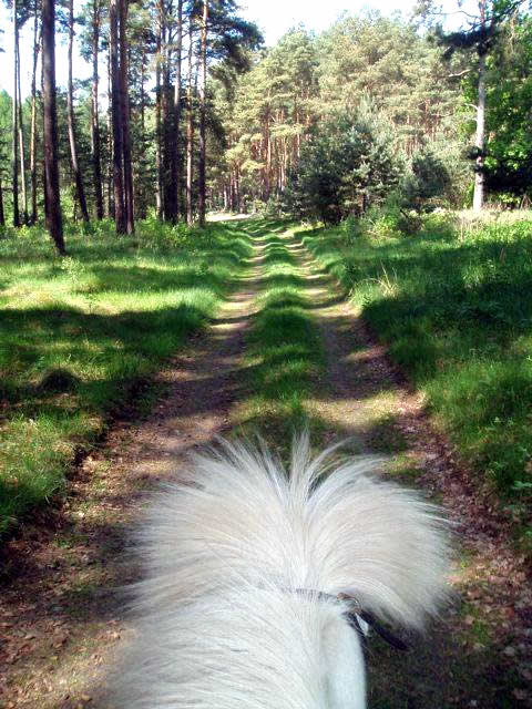 Dunkle Kiefernwälder, helle Laubwälder, kleine Lichtungen dazwischen. Gelb blühende Rapsfelder, rote Mohnblumen am Rand der Kornfelder. Am Bach entlang, in dem die Schwertlilien blühen. Ein flacher See, ein kleiner Berg. Verschlungene Wege im dichten Tann, breite lange Galopp- oder Töltstrecken.